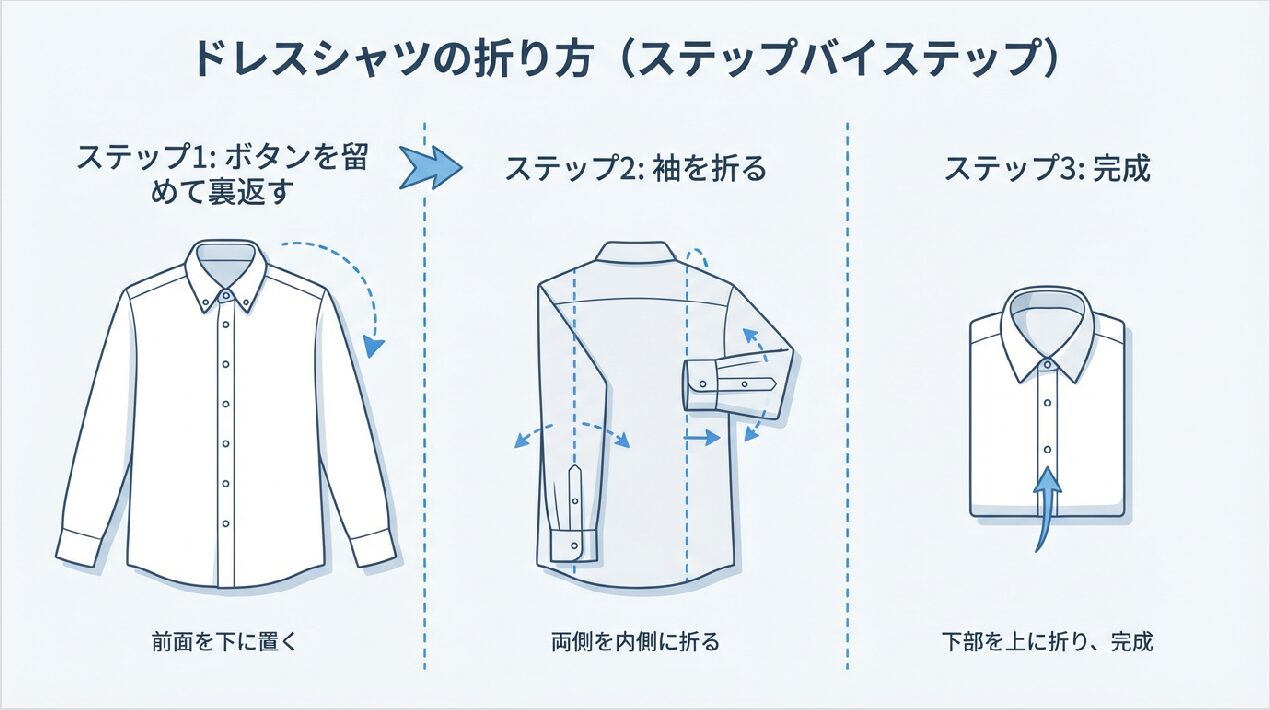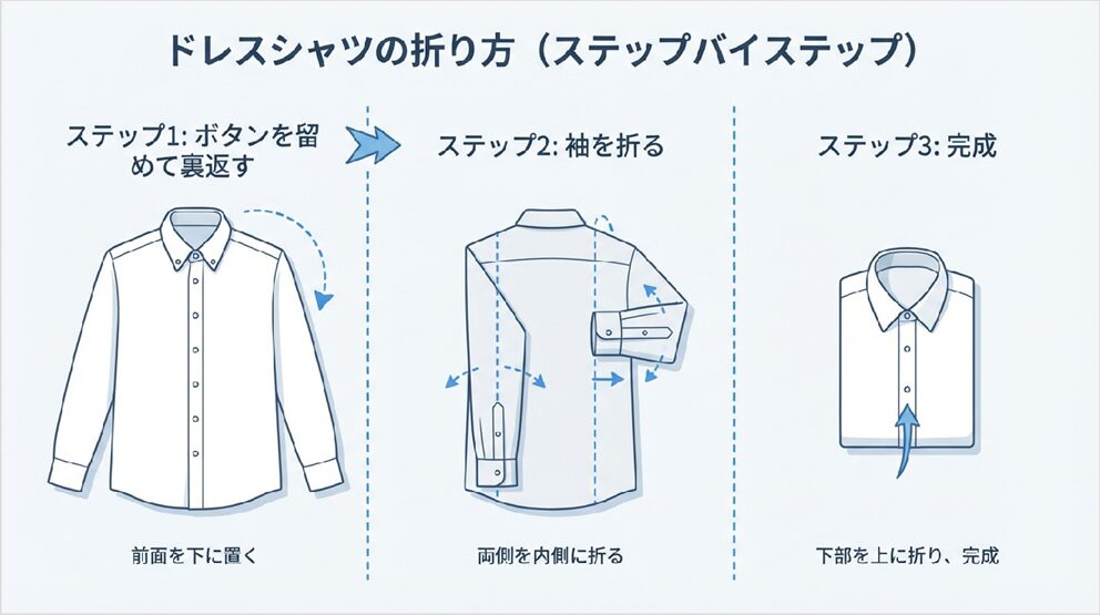 まずは、ワイシャツの基本のたたみ方をマスターしましょう!この方法は自宅での収納にも出張時にも使える万能なテクニックです。